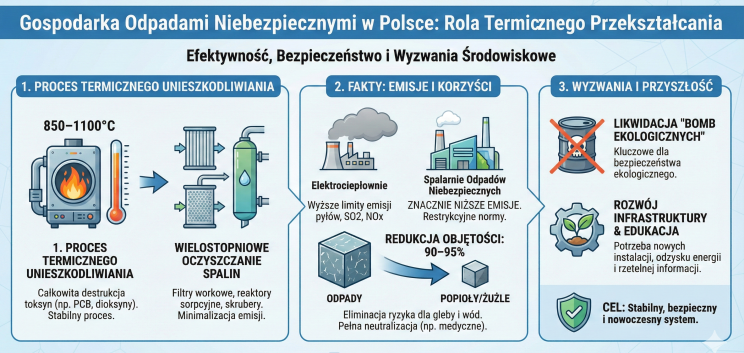 Polskie instalacje termicznego przekształcania odpadów niebezpiecznych wyposażone są w wielostopniowe systemy oczyszczania spalin, obejmujące m.in. filtry workowe, reaktory sorpcyjne, skrubery oraz katalityczne układy redukcji tlenków azotu. Dzięki temu emisje z tych obiektów utrzymują się na poziomach znacząco niższych od obowiązujących norm. Należy przy tym podkreślić, że normy emisyjne dla spalarni odpadów są znacznie bardziej restrykcyjne niż w przypadku innych instalacji przemysłowych, takich jak elektrociepłownie, które mogą i faktycznie emitują do powietrza większe ilości pyłów, dwutlenku siarki czy tlenków azotu niż instalacje termicznego przekształcania odpadów. W porównaniu z metodami fizykochemicznymi lub składowaniem, termiczne przetwarzanie eliminuje również konieczność długoterminowego monitoringu oraz ryzyko migracji zanieczyszczeń do gleby i wód podziemnych.